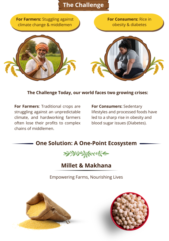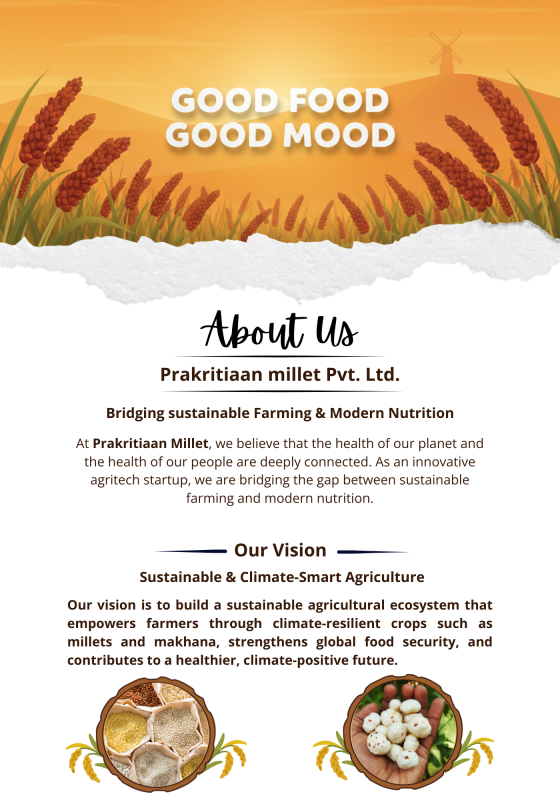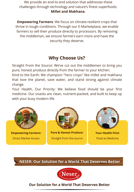 NESER is powered by PrakritiAan Millet Pvt Ltd, an agritech startup driven by a clear purpose to create meaningful impact for both farmers and consumers. We offer an integrated, one-point solution for climate-resilient crops like millets and makhana, using technology to ensure transparency, fair pricing, and direct market access.