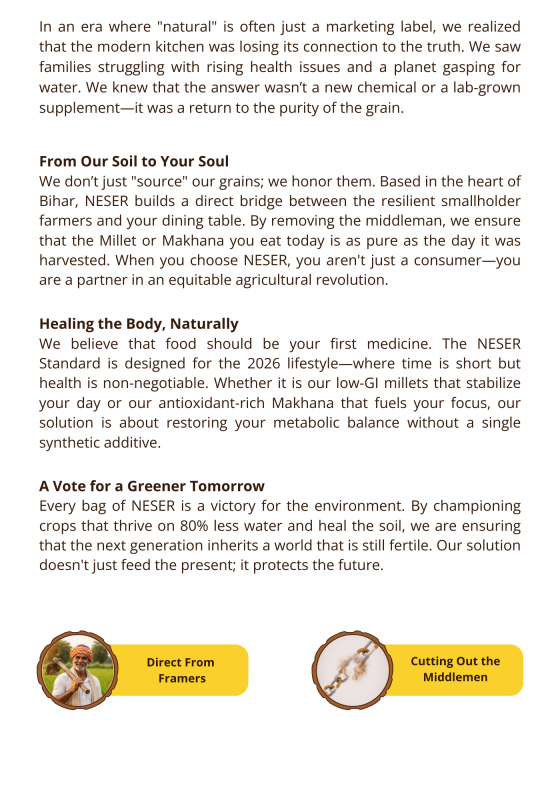 Through the NESER brand, we bring wholesome, nutrient-rich products to families that naturally support healthy living and help manage lifestyle challenges such as obesity and high blood sugar. We believe food should do more than fill plates it should empower farmers, nourish communities, and build a healthier future for all.